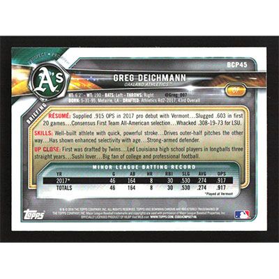 This is a 2018 Bowman Chrome Prospects Greg Deichmann baseball card. The card is #BCP45 and pictures show condition.