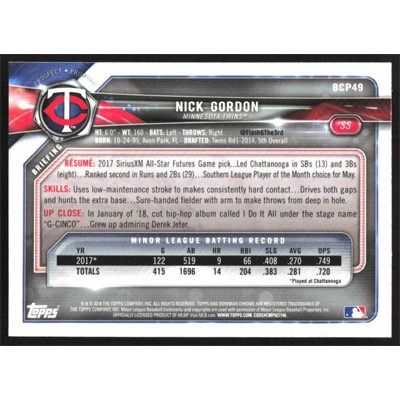 This is a 2018 Bowman Chrome Prospects Nick Gordon baseball card. The card is #BCP49 and pictures show condition.