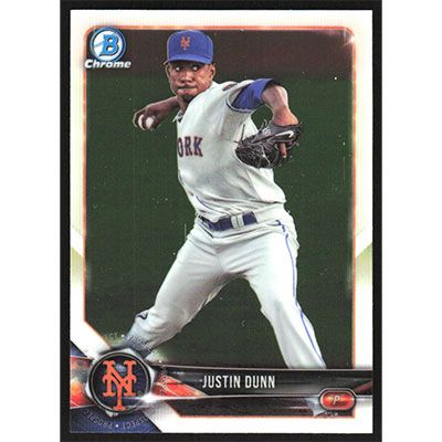 This is a 2018 Bowman Chrome Prospects Justin Dunn baseball card. The card is #BCP82 and pictures show condition.