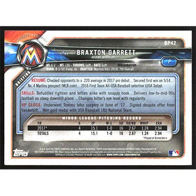 This is a 2018 Bowman Prospects Braxton Garrett baseball card. The card is #BP42 and pictures show condition.