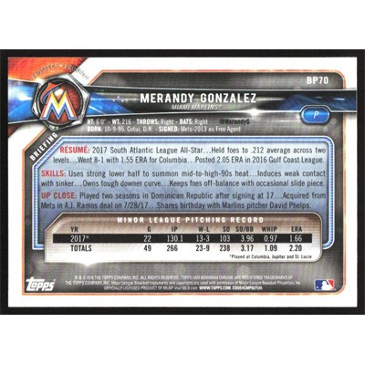This is a 2018 Bowman Prospects Merandy Gonzalez baseball card. The card is #BP70 and pictures show condition.