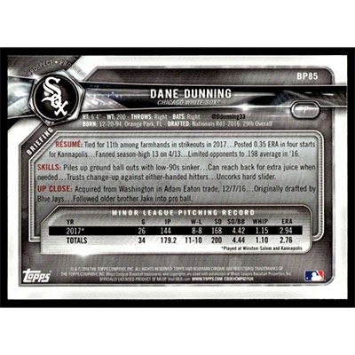 This is a 2018 Bowman Prospects Dane Dunning baseball card. The card is #BP85 and pictures show condition.