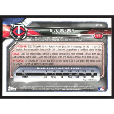This is a 2018 Bowman Prospects Camo Nick Gordon baseball card. The card is #BP49 and pictures show condition.