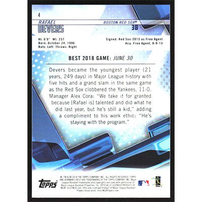 This is a 2018 Bowman's Best Rafael Devers baseball card. The card is #4 and pictures show condition.