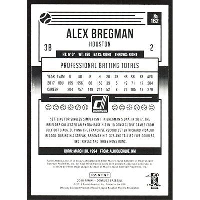 This is a 2018 Donruss Alex Bregman baseball card. The card is #162 and pictures show condition.