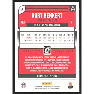 This is a 2018 Donruss Optic Kurt Benkert football card. The card is #149 and pictures show condition.