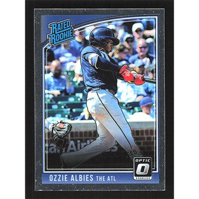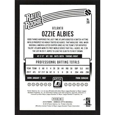 This is a 2018 Donruss Optic Ozzie Albies Rated Rookie baseball card. The card is #36 and pictures show condition. Team(s): Atlanta Braves Rookie Card (RC)