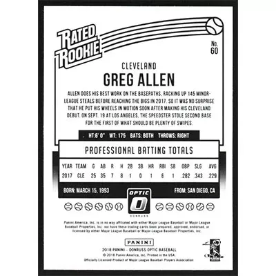 This is a 2018 Donruss Optic Greg Allen Rated Rookie baseball card. The card is #60 and pictures show condition. Team(s): Cleveland Indians Rookie Card (RC)