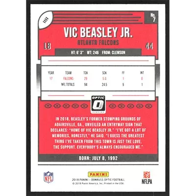 This is a 2018 Donruss Optic Vic Beasley Jr. football card. The card is #7 and pictures show condition.