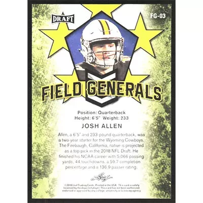 This is a 2018 Leaf Draft Field Generals Josh Allen football card. The card is #FG-03 and pictures show condition.