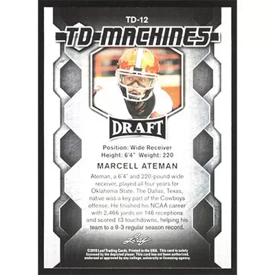 This is a 2018 Leaf Draft TD Machines Marcell Ateman football card. The card is #TD-12 and pictures show condition.