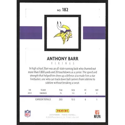 This is a 2018 Panini Anthony Barr football card. The card is #182 and pictures show condition.