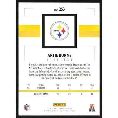 This is a 2018 Panini Artie Burns football card. The card is #253 and pictures show condition.
