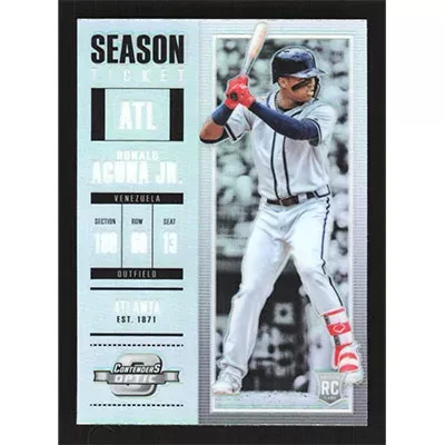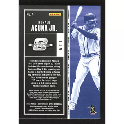 This is a 2018 Panini Chronicles Contenders Optic Holo Ronald Acuña Jr. baseball card. The card is #4 and pictures show condition. Team(s): Atlanta Braves Rookie Card (RC)