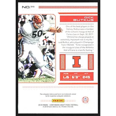 This is a 2018 Panini Contenders Draft Picks Dick Butkus football card. The card is #35 and pictures show condition.