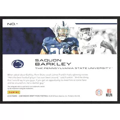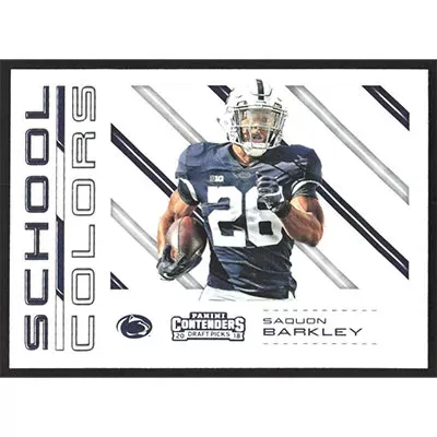 This is a 2018 Panini Contenders Draft Picks School Colors Saquon Barkley football card. The card is #5 and pictures show condition. Team: Penn State Nittany Lions