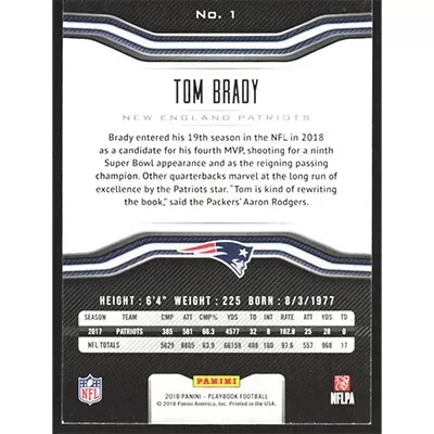 This is a 2018 Panini Playbook Tom Brady football card. The card is #1 and pictures show condition.