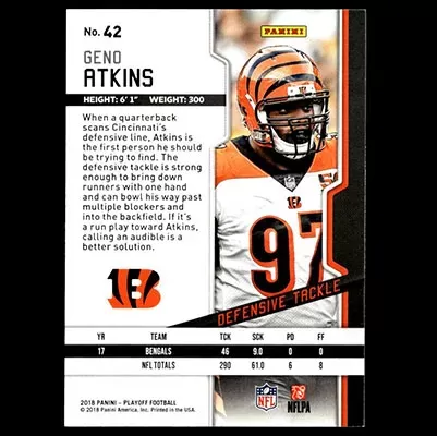 This is a 2018 Panini Playoff Geno Atkins football card. The card is #42 and is in NM-MT condition.