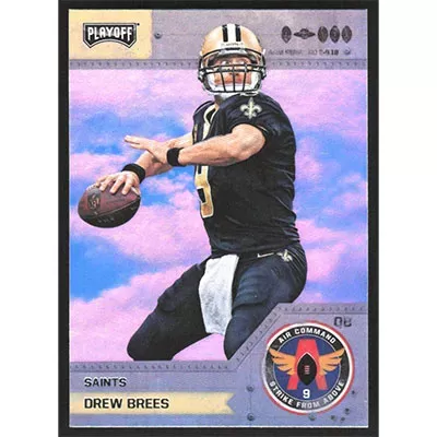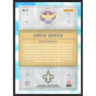 This is a 2018 Panini Playoff Air Command Strike from Above Drew Brees football card. The card is #5 and pictures show condition. Team: New Orleans Saints