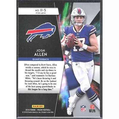 This is a 2018 Panini Prizm Instant Impact Silver Josh Allen football card. The card is #II-5 and pictures show condition. Team: Buffalo Bills Rookie Card