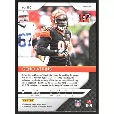 This is a 2018 Panini Prizm Red White and Blue Geno Atkins football card. The card is #160 and pictures show condition.