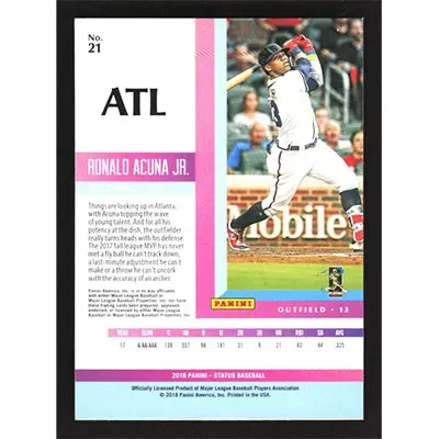 This is a 2018 Panini Status Ronald Acuña Jr. baseball card. The card is #21 and pictures show condition.