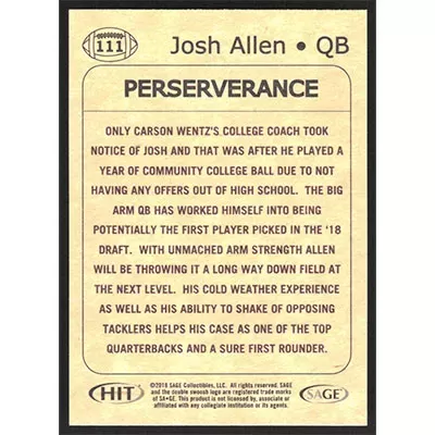 This is a 2018 SAGE HIT Josh Allen Aspire Perserverance football card. The card is #111 and pictures show condition.