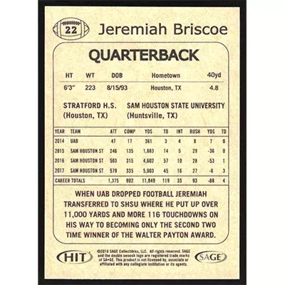 This is a 2018 SAGE HIT Jeremiah Briscoe football card. The card is #22 and pictures show condition. Team(s): Sam Houston State Bearkats Rookie Card (RC)