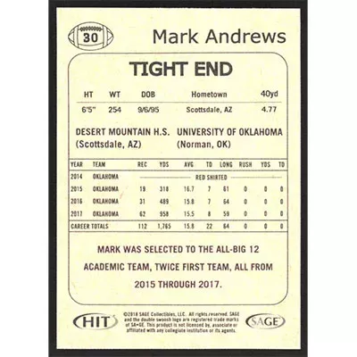 This is a 2018 SAGE HIT Mark Andrews football card. The card is #30 and pictures show condition.
