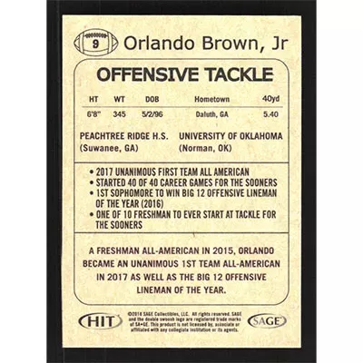 This is a 2018 SAGE HIT Orlando Brown Jr. football card. The card is #9 and pictures show condition.