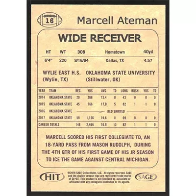 This is a 2018 SAGE HIT Silver Marcell Ateman football card. The card is #16 and pictures show condition.
