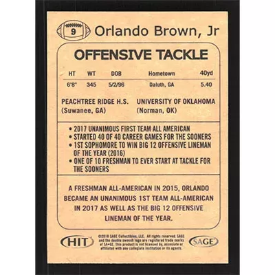 This is a 2018 SAGE HIT Silver Orlando Brown Jr. football card. The card is #9 and pictures show condition.