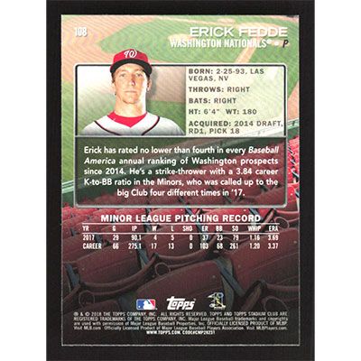 This is a 2018 Stadium Club Erick Fedde baseball card. The card is #108 and pictures show condition.