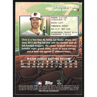This is a 2018 Stadium Club Chris Davis baseball card. The card is #122 and pictures show condition.
