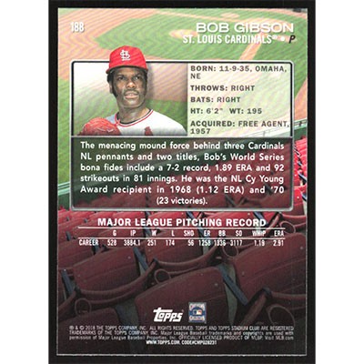 This is a 2018 Stadium Club Bob Gibson baseball card. The card is #188 and pictures show condition.