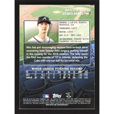 This is a 2018 Stadium Club Max Fried baseball card. The card is #217 and pictures show condition.
