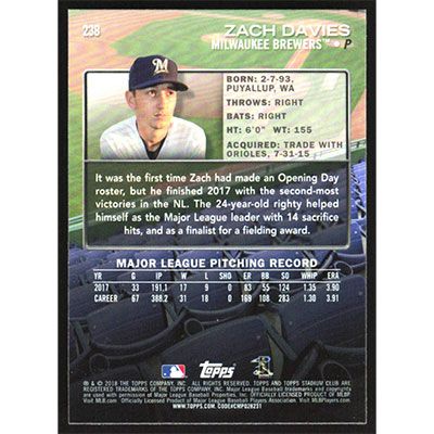 This is a 2018 Stadium Club Zach Davies baseball card. The card is #238 and pictures show condition.