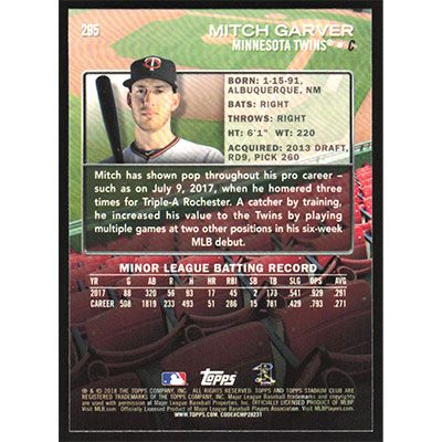 This is a 2018 Stadium Club Mitch Garver baseball card. The card is #295 and pictures show condition.