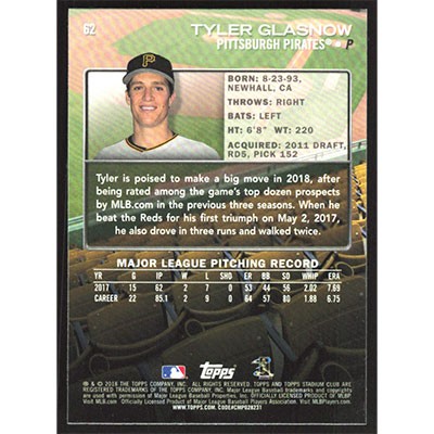 This is a 2018 Stadium Club Tyler Glasnow baseball card. The card is #62 and pictures show condition.