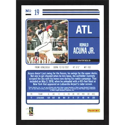 This is a 2018 Studio Ronald Acuña Jr. baseball card. The card is #19 and pictures show condition.