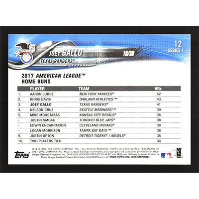 This is a 2018 Topps Joey Gallo League Leaders baseball card. The card is #12 and pictures show condition.