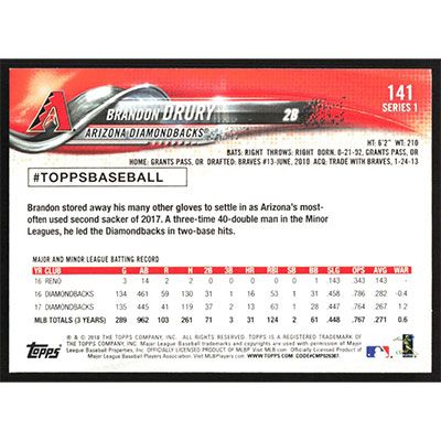 This is a 2018 Topps Brandon Drury baseball card. The card is #141 and pictures show condition.