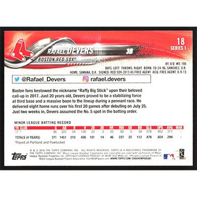 This is a 2018 Topps Rafael Devers baseball card. The card is #18 and pictures show condition.