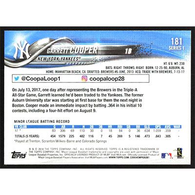 This is a 2018 Topps Garrett Cooper baseball card. The card is #181 and pictures show condition.