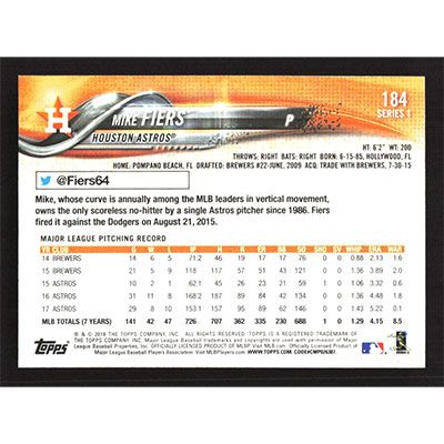 This is a 2018 Topps Mike Fiers baseball card. The card is #184 and pictures show condition.