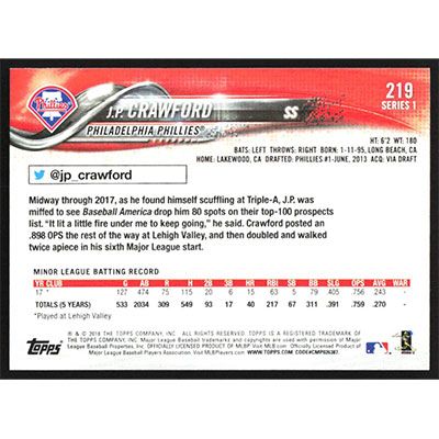 This is a 2018 Topps J.P. Crawford baseball card. The card is #219 and pictures show condition.