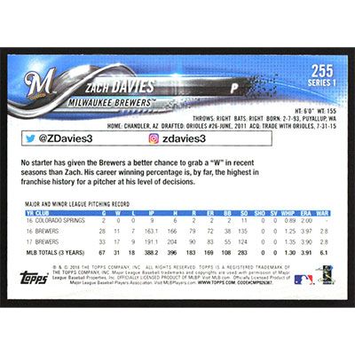 This is a 2018 Topps Zach Davies baseball card. The card is #255 and pictures show condition.