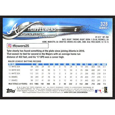 This is a 2018 Topps Tyler Flowers autographed baseball card. This card has been signed, in blue, by Tyler Flowers, and is guaranteed authentic by Ballcardz.com. The card is #328 and pictures show condition.