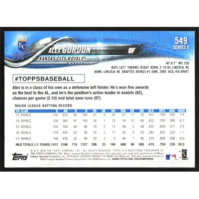 This is a 2018 Topps Alex Gordon autographed baseball card. This card has been signed, in blue, by Alex Gordon, and is guaranteed authentic by Ballcardz.com. The card is #549 and pictures show condition.