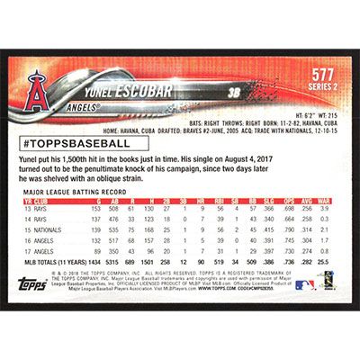 This is a 2018 Topps Yunel Escobar baseball card. The card is #577 and pictures show condition.